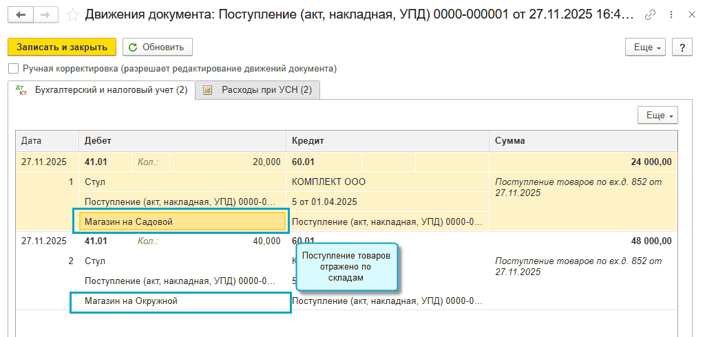 При корректировке поступления, которое оформлено на несколько складов, склады заполняются как в поступлении, изменить их нельзя.