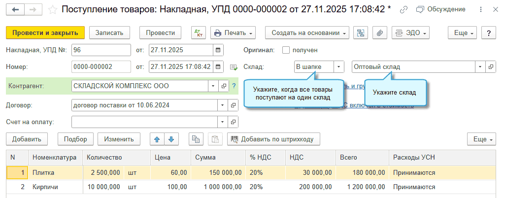Добавлена возможность использовать один документ поступления товаров в тех случаях, когда поставщик выдает один УПД (накладную), а организация оформляет несколько Приходных ордеров (М-4), потому что товары поступают на несколько разных складов. Теперь для отражения таких ситуаций не требуется проводить дополнительные перемещения товаров между складами.