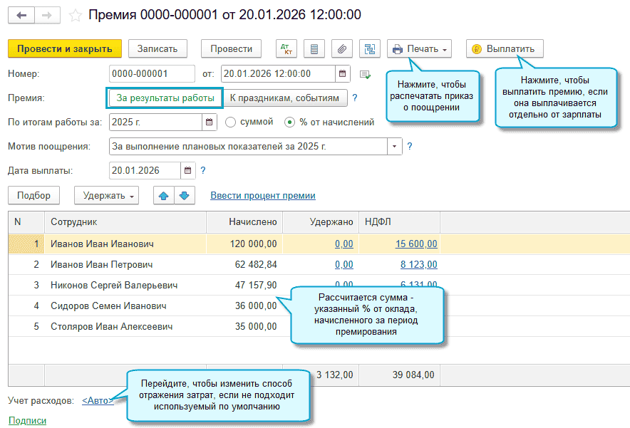 При начислении премии потребуется указать, какая премия выплачивается - за результаты работы или к празднику, период премирования, процент или сумму премии. Исходя из этих параметров премия за результаты работы потом учитывается в расчете среднего заработка.