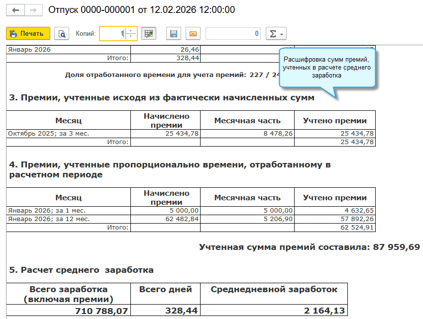 Чтобы посмотреть полный расчет отпускных, распечатайте расчет среднего заработка.