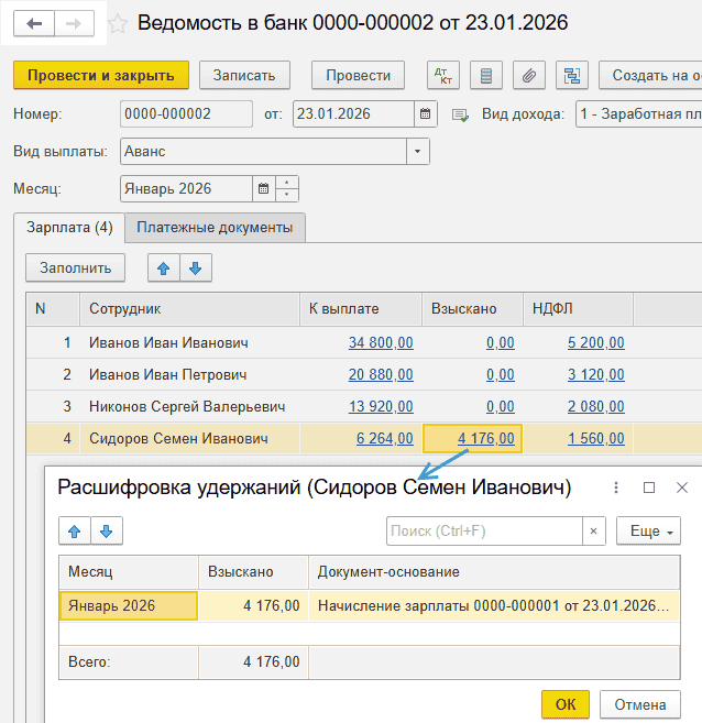 Удержанные суммы теперь расшифровываются в ведомостях по документам, в которых проводилось удержание.
