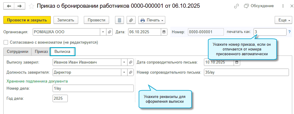Добавлена возможность распечатать отдельные выписки из приказа о бронировании по военкоматам по местам учета сотрудников (Постановление МВК от 18.06.2025 № 4пр-МВК).