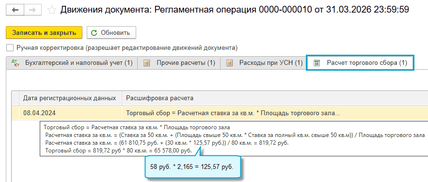 Полный интерфейс: меню "Операции - Закрытие периода - Закрытие месяца - Расчет торгового сбора".