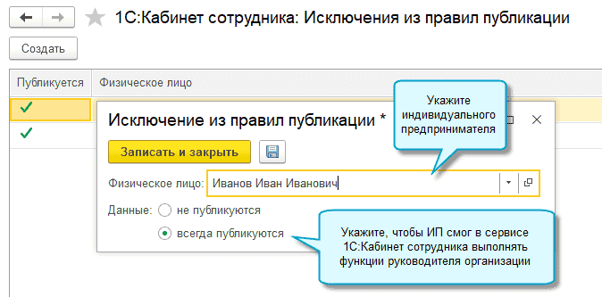 Теперь индивидуальный предприниматель может работать как руководитель организации в сервисе 1С:Кабинет сотрудника. Функционал доступен, если используется сервис 1С:Кабинет сотрудника версии 8.3.