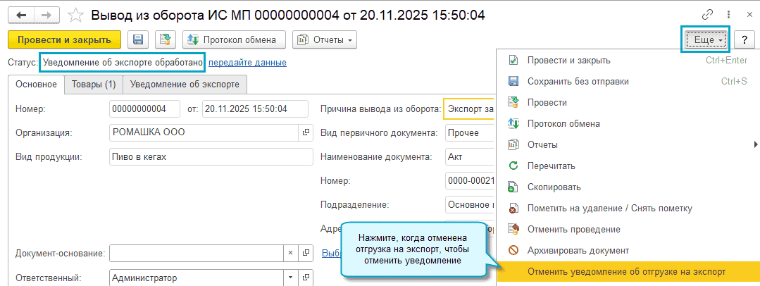 Если отгрузка отменена после передачи уведомления в ГИС МТ, его требуется отменить.