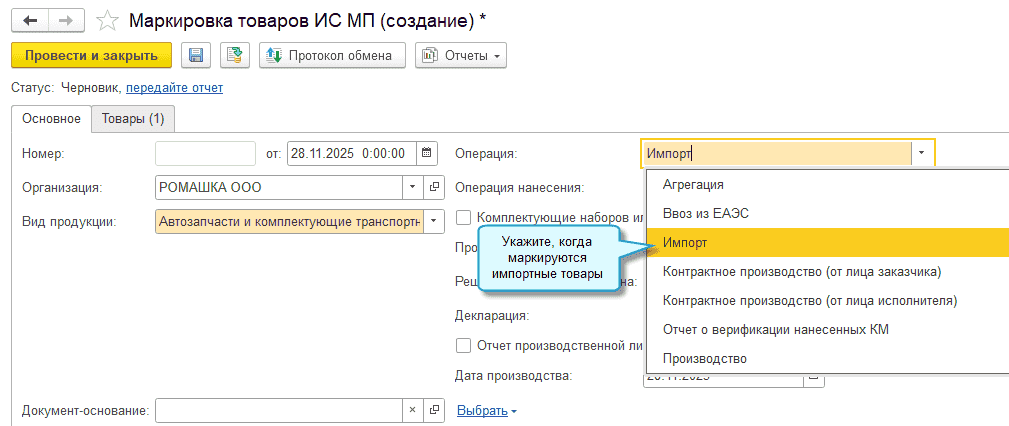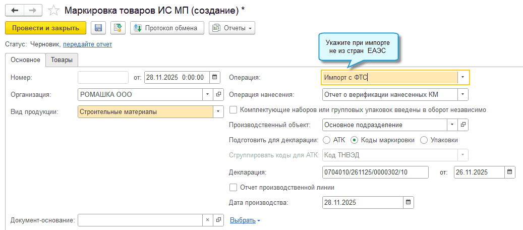 Добавлена возможность маркировки товаров из группы Строительные материалы с операцией "Импорт с ФТС". В ходе маркировки можно подготовить коды для таможенной декларации на товары, исключив таким образом расхождение данных ФТС и ГИС МТ по кодам идентификации. Подробнее на примере молочной продукции см. здесь.