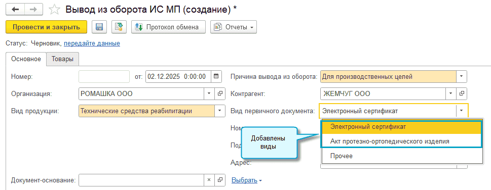 Добавлена возможность указать первичные документы Электронный сертификат и Акт протезно-ортопедического изделия при выводе из оборота технических средств реабилитации по причине "Использование для производственных целей".