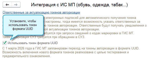 Полный интерфейс: меню"Администрирование – Настройки программы - Интеграция с ИС МП (Обувь, одежда, табак…)".