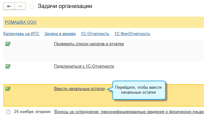 Теперь специальная задача организации напомнит о необходимости ввода остатков при начале учета в приложении.