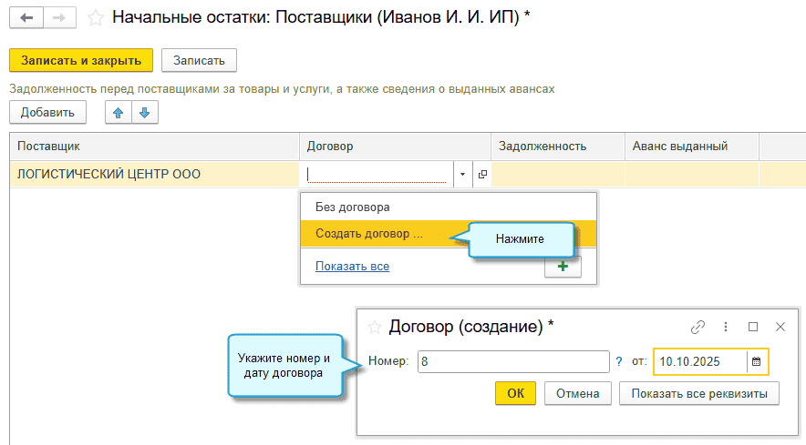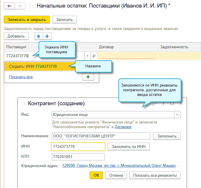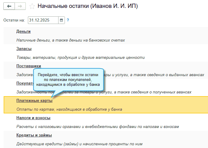 В упрощенном интерфейсе помощника по вводу начальных остатков добавлена возможность заполнять данные по контрагентам и договорам в сокращенном варианте - только те реквизиты, которые достаточны для ввода остатков. Добавлена возможность ввести начальные остатки по платежам покупателей по платежным картам.