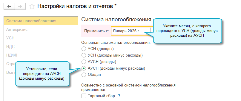 Полный интерфейс: меню "Главное - Настройки - Налоги и отчеты - Система налогообложения".