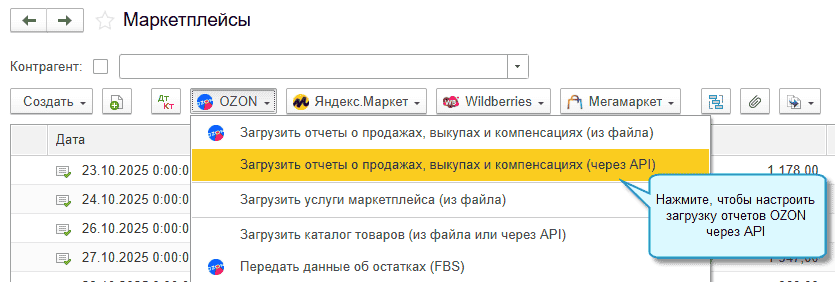 Открывайте журнал Маркетплейсы в день автоматической загрузки, чтобы посмотреть ее результат. Дозаполните и проведите документы, которые требуют проверки.