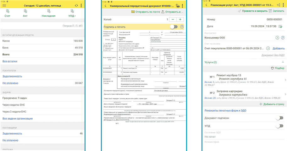 Мобильное приложение работает онлайн: созданные документы сразу видны в 1С:Бухгалтерии на компьютере.