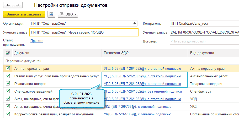 1 января 2026 года автоматически будет установлен во всех настройках ЭДО формат УПД 5.03 для товарной накладной и акта выполненных работ в связи с отменой этих форматов (Приказ ФНС России от 20.01.2025 № ЕД-7-26/28@).