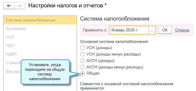 Добавлен помощник для отражения в учете перехода организации с начала года с УСН "доходы минус расходы" на Общую систему налогообложения с уплатой налога на прибыль.