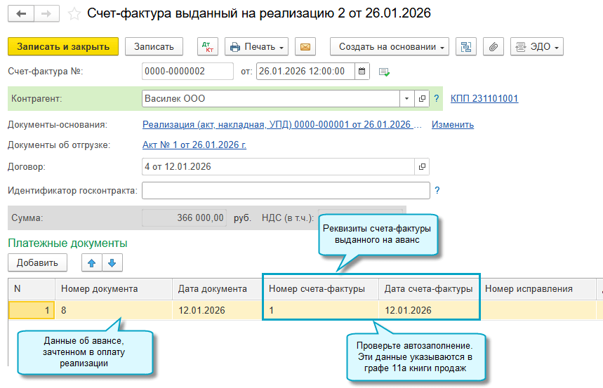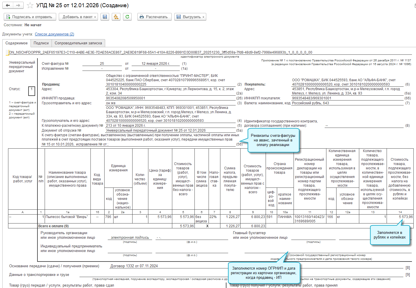 Поддержано изменение электронного счета-фактуры и УПД с 01.01.2026 (Письмо ФНС от 16.12.2025 № ЕА-4-26/11336@).