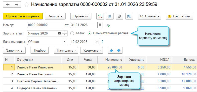 Простой интерфейс: меню "Сотрудники - Начисления - Начисление зарплаты".