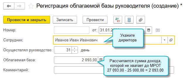 Если сотрудник осуществлял руководство организацией (занимал должность директора) меньше месяца, то сумма облагаемой базы будет определена исходя из МРОТ, скорректированного пропорционально дням.