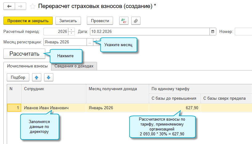 Простой интерфейс: меню "Сотрудники - Взносы и пособия - Страховые взносы - Регистрации облагаемой базы руководителя".