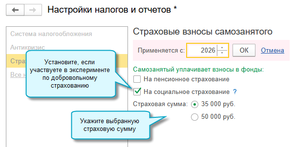 Полный интерфейс: меню "Главное - Настройки - Налоги и отчеты - Страховые взносы".