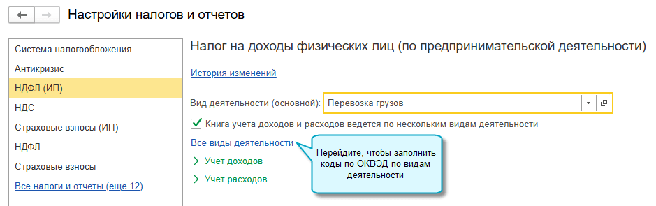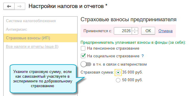 Полный интерфейс: меню "Главное - Настройки - Налоги и отчеты - Страховые взносы (ИП)".