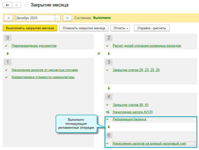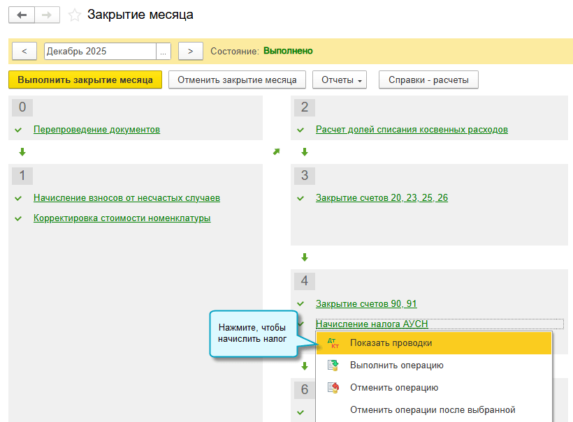 Полный интерфейс: меню "Операции - Закрытие периода - Закрытие месяца - Начисление налога АУСН".