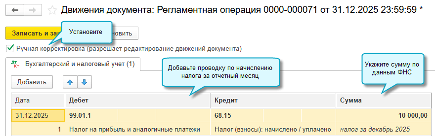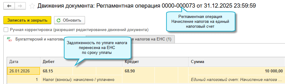 Налог начисляется автоматически, когда подключен обмен с сервисом АУСН. Достаточно выполнить регламентную операцию Начисление налогов на единый налоговый счет. Документы Корректировка ЕНС не используются.