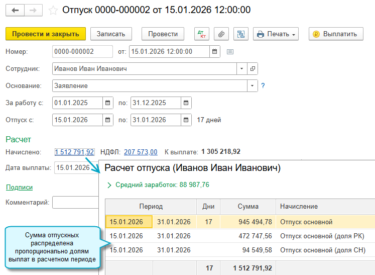 Начиная с 2026 года выделяются суммы районных коэффициентов и северных надбавок при выплате отпускных и компенсаций за неиспользованный отпуск при увольнении (Федеральный закон от 28.11.2025 № 425-ФЗ).