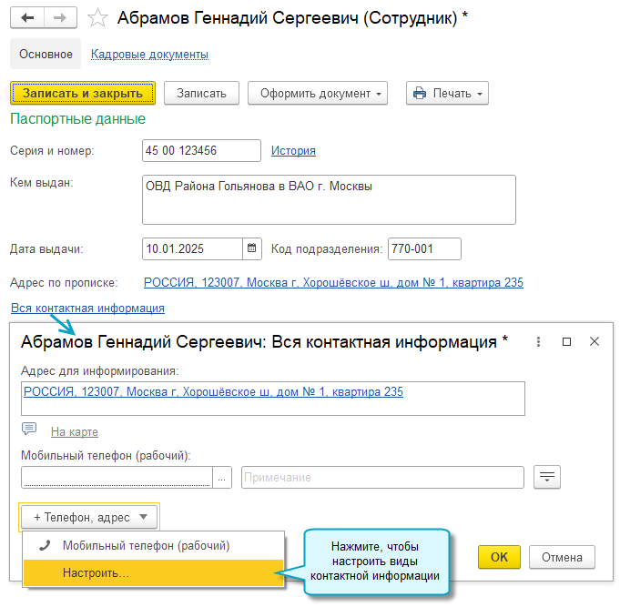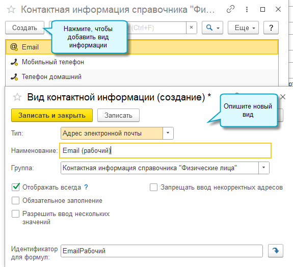 Добавьте свои виды контактной информации (e-mail и мобильный телефон) для карточек сотрудников, чтобы потом указать их для выгрузки в Smartway.