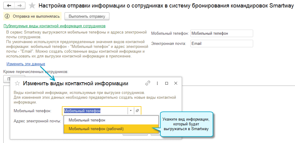 Добавлена возможность настроить виды контактной информации для выгрузки e-mail и мобильных телефонов сотрудников в Smartway.