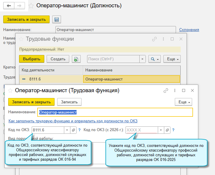 Добавлена возможность указать в карточках должностей коды по ОКЗ, применяемые с 01.01.2026.