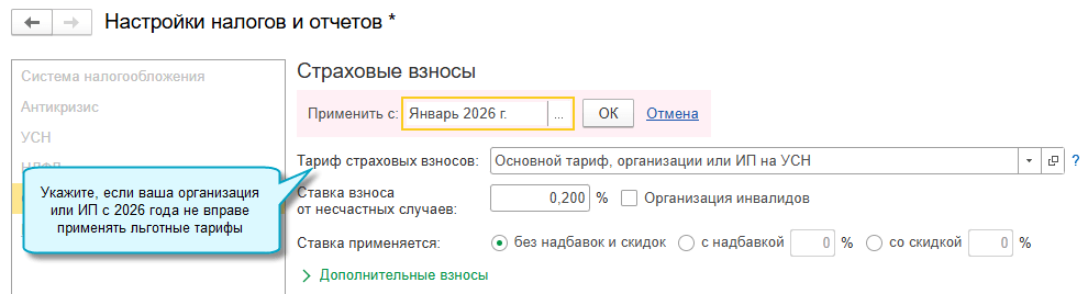 Проверьте, выполняются ли условия применения льготных тарифов страховых взносов по вашей организации, если нет - укажите с января 2026 года основной тариф.