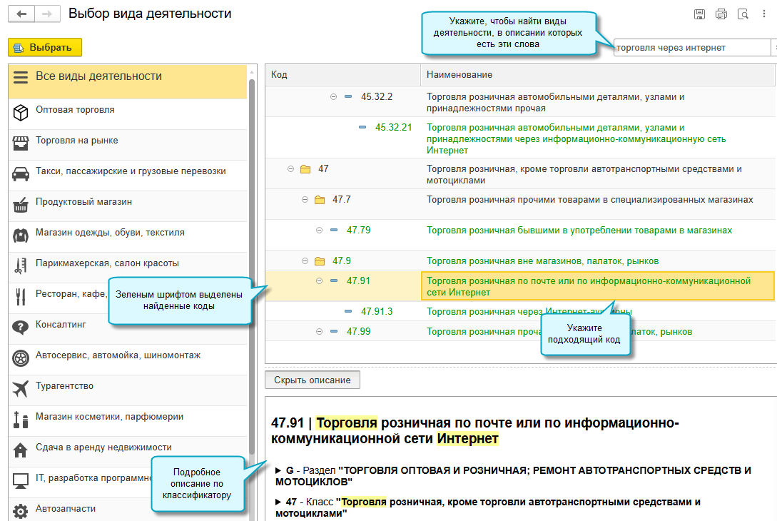 Рекомендуем проверить код ОКВЭД, указанный в карточке организации. Для подбора кода в карточке добавлено подробное описание кодов по классификатору ОКВЭД, что облегчает поиск подходящего кода.