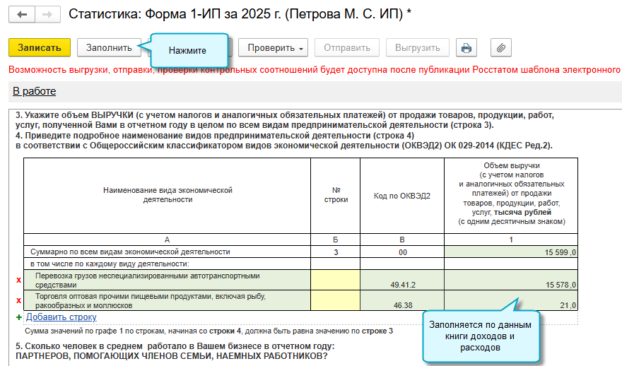 Сумма выручки заполняется по данным Книги учета доходов и расходов. Для распределения выручки по кодам ОКВЭД используются настройки видов деятельности.