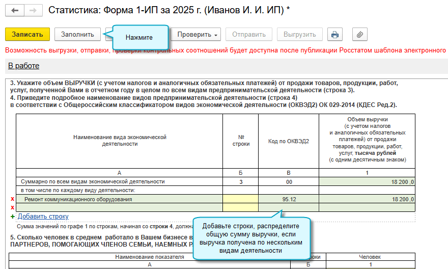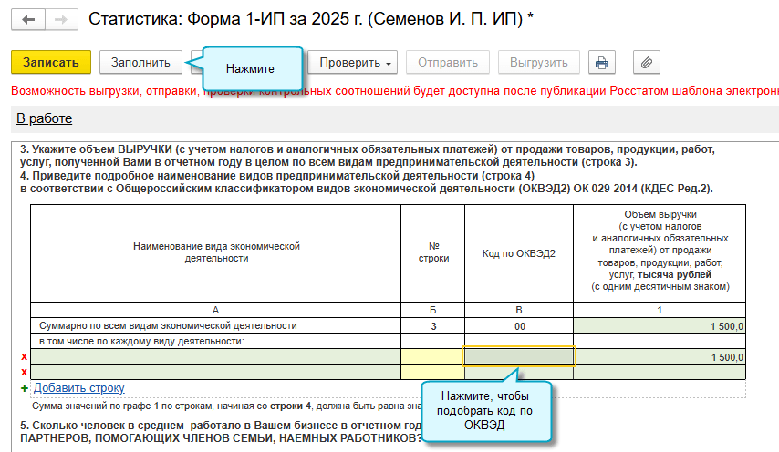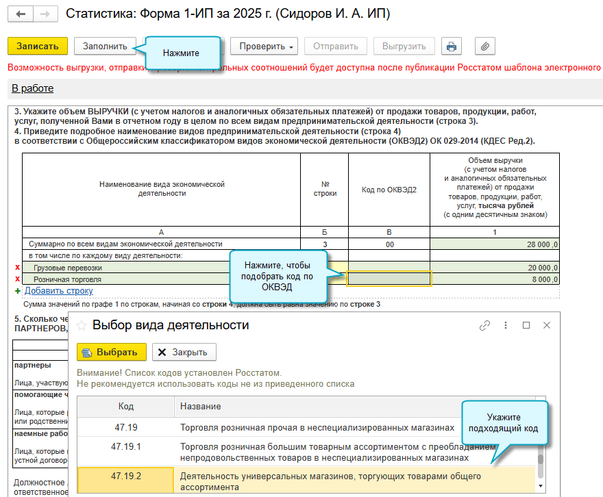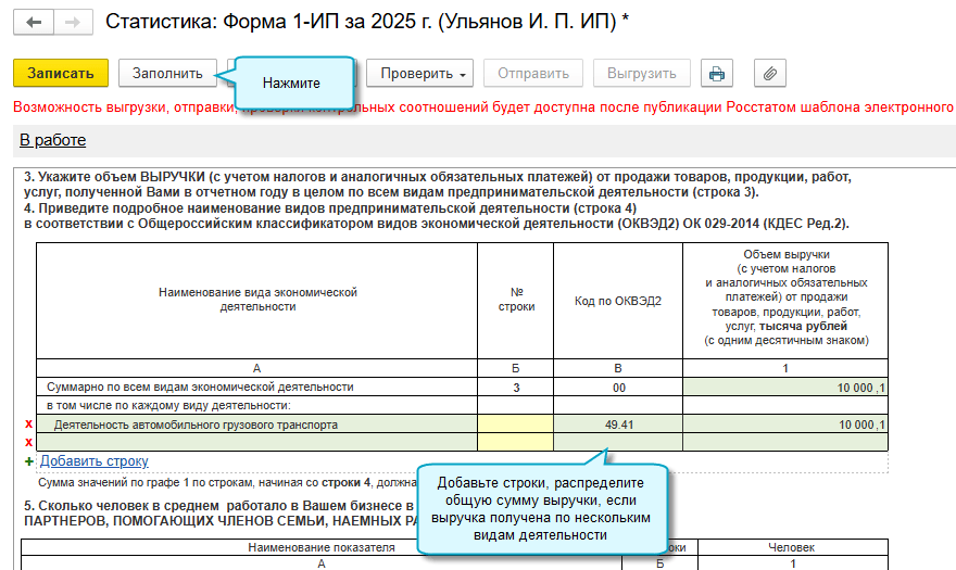 Добавлено автозаполнение сведений о выручке индивидуального предпринимателя в форме N 1-ИП (годовая). Действует форма с 01.01.2026 начиная с отчета за 2025 год (Приказ Росстата от 22.07.2025 № 349).