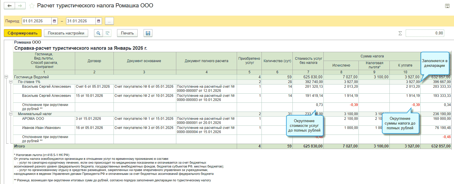 С января 2026 г. туристический налог рассчитывается ежемесячно. Сделано это в связи с проектом декларации по туристическому налогу с 2026 года. Если в течение квартала изменится ставка налога, то потребуется заполнить отдельные листы декларации по месяцам. Стоимость услуг и сумма налога в расчете теперь округляются до полных рублей. Подробнее ...