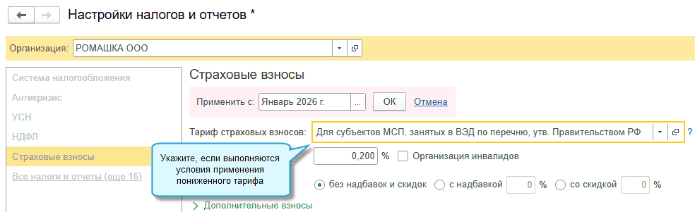 Поддержано применение пониженного тарифа страховых взносов для субъектов малого и среднего предпринимательства с 01.01.2026 (Федеральный закон от 28.11.2025 № 425-ФЗ, Распоряжение Правительства от 27.12.2025 № 4125-р).