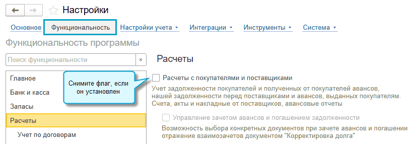 Простой интерфейс: меню "Настройки - Функциональность - Организация".