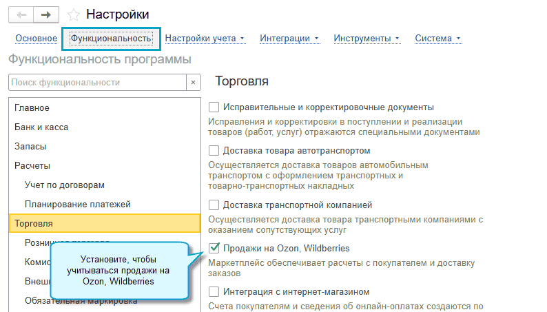 Добавлена возможность вести упрощенный учет продаж на OZON и Wildberries для тех, кому не требуется вести учет товаров и расчетов с контрагентами. При его использовании не нужно вводить документы по поступлению товаров от поставщиков и их отгрузке на маркетплейсы.