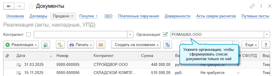 В журналах можно устанавливать - смотреть документы по одной организации или по всем.