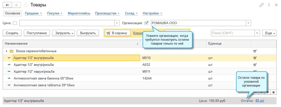 Теперь можно отказаться от вывода информации об остатках в списках Товары и Контрагенты в простом интерфейсе. Это пригодится, когда ведется учет нескольких организаций с большой номенклатурой или количеством контрагентов. Списки будут быстрее формироваться без остатков.