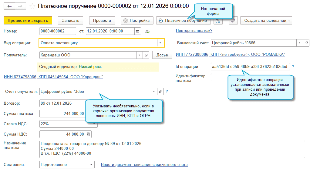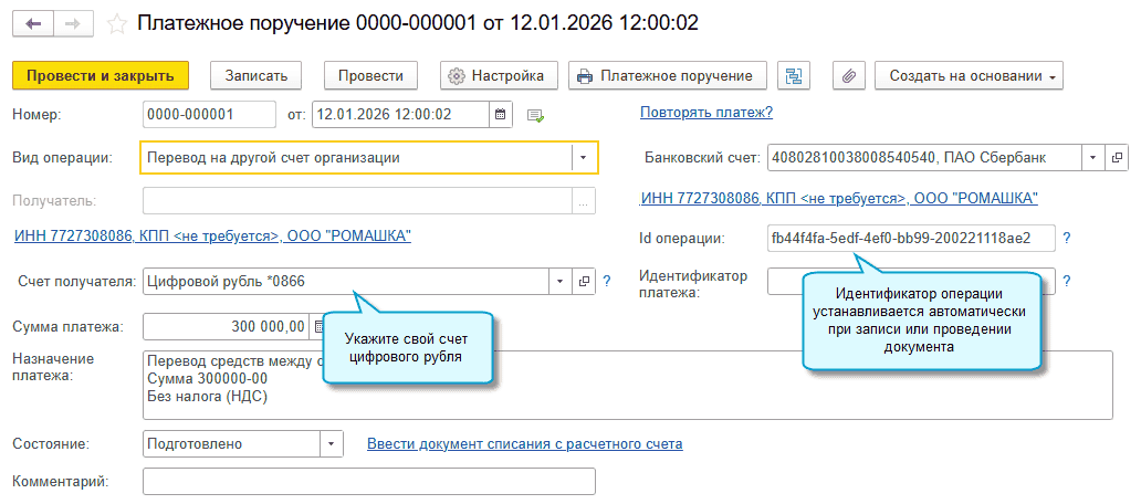 Добавлена возможность выгружать в банк данные для заполнения распоряжений по счету цифрового рубля. Для этого используется документ Платежное поручение. Доступны пока операции по оплате поставщику и по переводу между своими счетами.