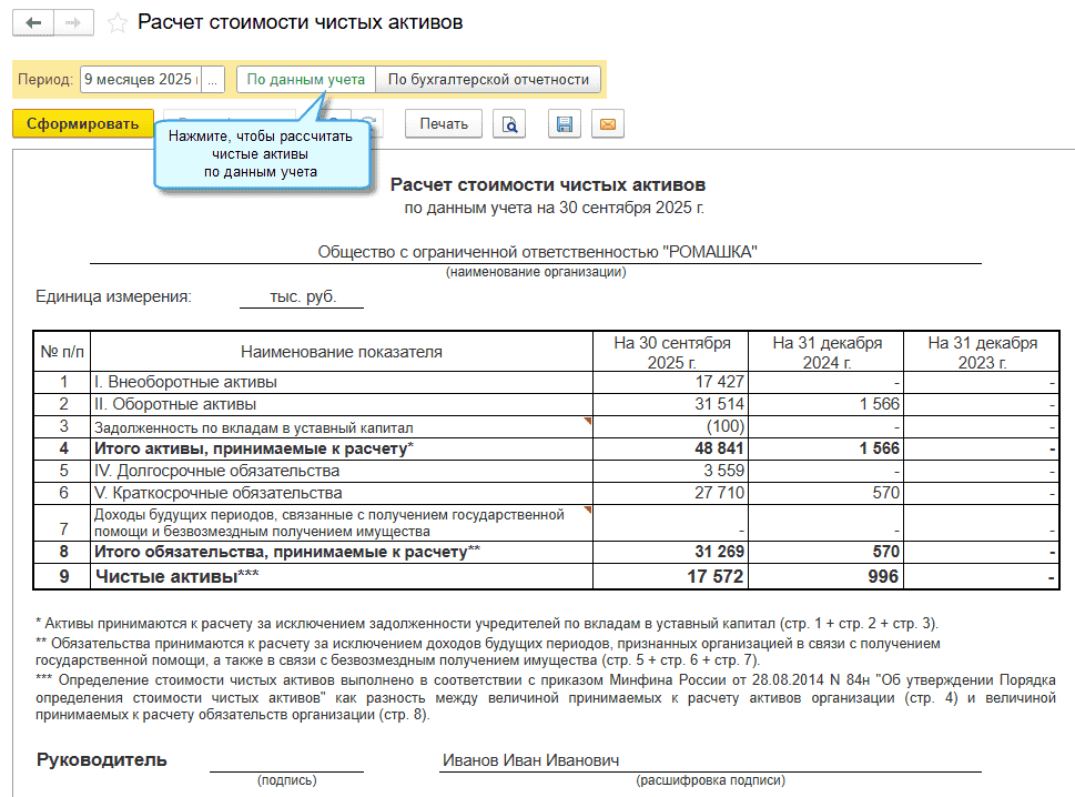 Полный интерфейс: меню "Руководителю - Анализ - Расчет стоимости чистых активов" или "Отчеты - Отчеты для руководителя - Расчет стоимости чистых активов".