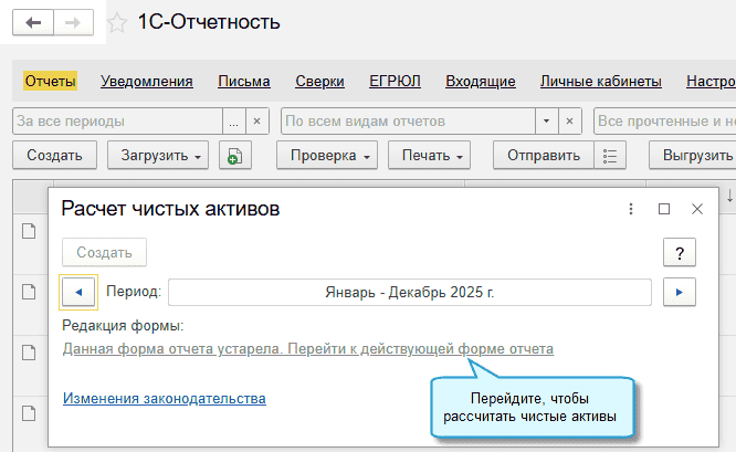 Полный интерфейс: меню "Отчеты - 1С-Отчетность - Регламентированные отчеты - Отчеты - Бухгалтерская отчетность - Расчет чистых активов".