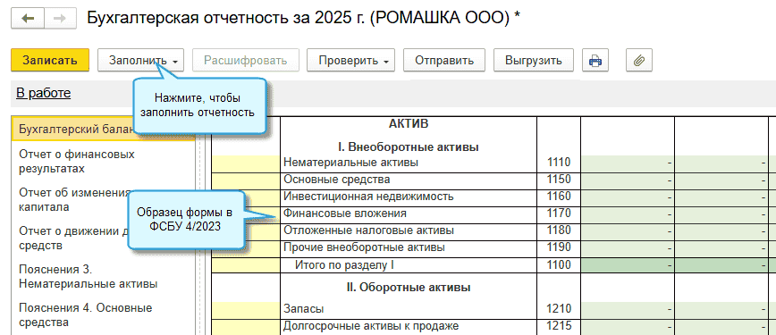 Функционал доступен начиная с отчетности за 2025 год для форм полной бухгалтерской отчетности, утвержденной Приказом Минфина России от 04.10.2023 № 157н в редакции Приказа Минфина России от 07.11.2025 № 159н.