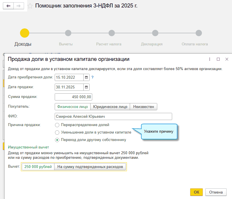 Поддержан расчет НДФЛ по доходам в связи с продажей и прочим выбытием доли в уставном капитале организации через помощник.
