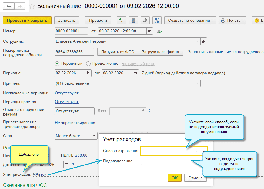 Теперь для расходов на оплату больничного листа можно задать свой способ учета и подразделение, например, при оплате больничного работающим по договорам подряда.