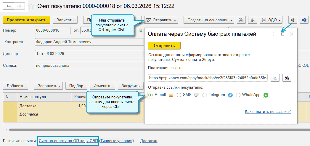 Полный интерфейс: меню "Администрирование - Настройки программы - Интернет поддержка и сервисы - Платежные системы (СБП) - Настройки подключения".