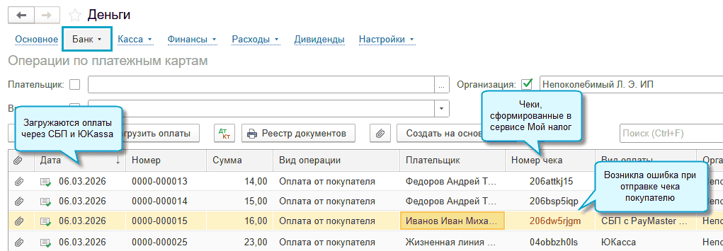 Простой интерфейс: меню "Деньги - Банк - Операции по платежным картам".
