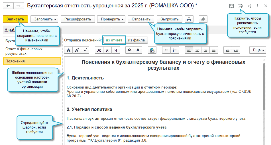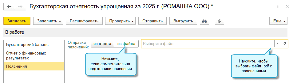 Начиная с отчетности за 2025 год все организации должны отправлять в ФНС пояснения в составе бухгалтерской отчетности, в том числе упрощенной (п. 52 ФСБУ 4/2023).